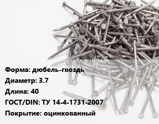 Гвоздь дюбель-гвоздь 3.7х40 ГОСТ: ТУ 14-4-1731-2007 оцинкованный