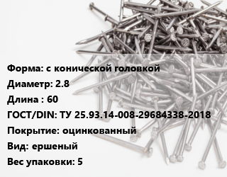 Гвоздь с конической головкой 2.8х60 ГОСТ: ТУ 25.93.14-008-29684338-2018 оцинкованный ершеный 5