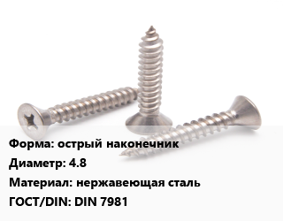 Саморез острый наконечник D=4.8 нержавеющая сталь ГОСТ: DIN 7981