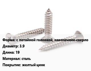 Саморез с потайной головкой, наконечник-сверло D=3.9 L=19 сталь желтый цинк, упаковка 300 шт цена от 53.1 Р / кг, где купить, условия доставки в Витебске и Витебской области