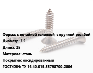Саморез с потайной головкой, с крупной резьбой D=3.5 L=25 сталь оксидированный ГОСТ: ТУ 16 40-015-55798700-2006, кг цена от 132.43 Р / кг, где купить, условия доставки в Витебске и Витебской области