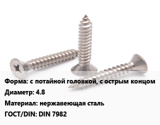 Саморез с потайной головкой, с острым концом D=4.8 нержавеющая сталь ГОСТ: DIN 7982