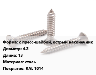 Саморез с пресс-шайбой, острый наконечник D=4.2 L=13 сталь RAL 1014, упаковка 1000 шт цена от 288.73 Р / кг, где купить, условия доставки в Витебске и Витебской области