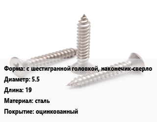 Саморез с шестигранной головкой, наконечик-сверло D=5.5 L=19 сталь оцинкованный, шт цена от 2.07 Р / кг, где купить, условия доставки в Витебске и Витебской области