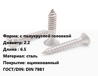 Саморез с полукруглой головкой D=2.2 L=6.5 сталь оцинкованный ГОСТ: DIN 7981