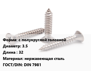 Саморез с полукруглой головкой D=3.5 L=32 нержавеющая сталь ГОСТ: DIN 7981