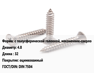 Саморез с полусферической головкой, наконечник-сверло D=4.8 L=32 оцинкованный ГОСТ: DIN 7504