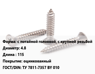 Саморез с потайной головкой, с крупной резьбой D=4.8 L=115 оцинкованный ГОСТ: ТУ 7811-7357 BY 010