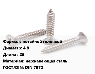 Саморез с потайной головкой D=4.8 L=25 нержавеющая сталь ГОСТ: DIN 7972