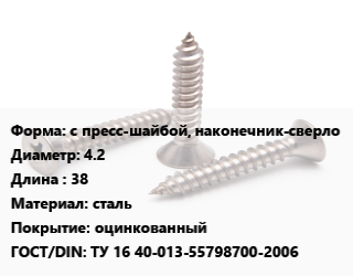 Саморез с пресс-шайбой, наконечник-сверло D=4.2 L=38 сталь оцинкованный ГОСТ: ТУ 16 40-013-55798700-2006