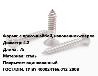 Саморез с пресс-шайбой, наконечник-сверло D=4.2 L=75 сталь оцинкованный ГОСТ: ТУ BY 400024166.012-2008, упаковка 1000 шт, РМЗ цена от 1 331 Р / кг, где купить, условия доставки в Витебске и Витебской области