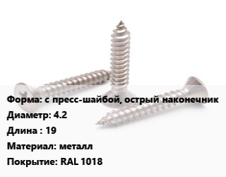 Саморез с пресс-шайбой, острый наконечник D=4.2 L=19 металл RAL 1018, упаковка 450 шт цена от 497.7 Р / кг, где купить, условия доставки в Витебске и Витебской области
