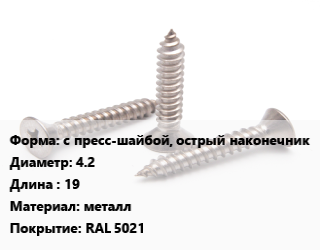 Саморез с пресс-шайбой, острый наконечник D=4.2 L=19 металл RAL 5021, упаковка 450 шт цена от 497.7 Р / кг, где купить, условия доставки в Витебске и Витебской области
