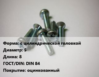 Винт с цилиндрической головкой 5х8 DIN 84 оцинкованный, цена за шт, кг цена от 2.7 Р / кг, где купить, условия доставки в Витебске и Витебской области