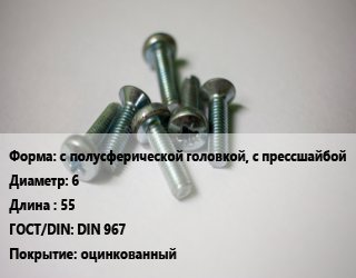 Винт с полусферической головкой, с прессшайбой 6х55 DIN 967 оцинкованный, РМЗ,упаковка, кг цена от 129.15 Р / кг, где купить, условия доставки в Витебске и Витебской области