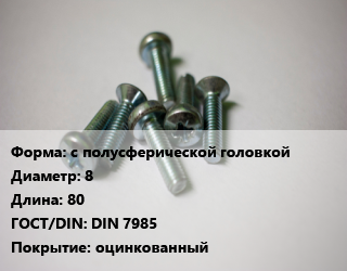 Винт с полусферической головкой 8х80 DIN 7985 оцинкованный, цена за 1000 шт,цена за шт, кг цена от 13.31 Р / кг, где купить, условия доставки в Витебске и Витебской области