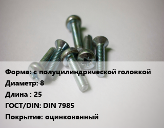 Винт с полуцилиндрической головкой 8х25 DIN 7985 оцинкованный, кг цена от 131.63 Р / кг, где купить, условия доставки в Витебске и Витебской области