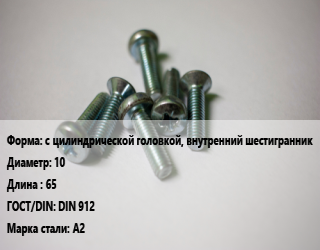 Винт с цилиндрической головкой, внутренний шестигранник 10х65 DIN 912 Сталь: A2, по запросу, кг цена от 20.66 Р / кг, где купить, условия доставки в Витебске и Витебской области