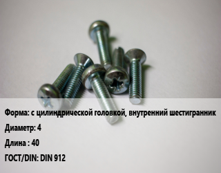 Винт с цилиндрической головкой, внутренний шестигранник 4х40 DIN 912, 12.9, цена за шт, кг цена от 3.63 Р / кг, где купить, условия доставки в Витебске и Витебской области