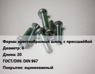 Винт крестообразный шлиц, с прессшайбой 8х20 DIN 967 оцинкованный, кг цена от 152.62 Р / кг, где купить, условия доставки в Витебске и Витебской области