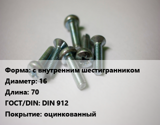 Винт с внутренним шестигранником 16х70 DIN 912 оцинкованный, 10.9,12.9,8.8, Китай,цена за шт, кг цена от 227.57 Р / кг, где купить, условия доставки в Витебске и Витебской области