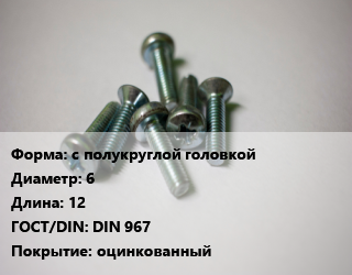 Винт с полукруглой головкой 6х12 DIN 967 оцинкованный, кг цена от 1 033 Р / кг, где купить, условия доставки в Витебске и Витебской области