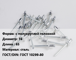 Заклепка с полукруглой головкой 16х65 сталь ГОСТ: ГОСТ 10299-80